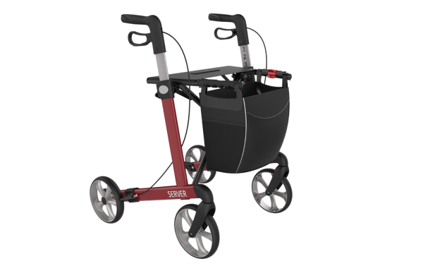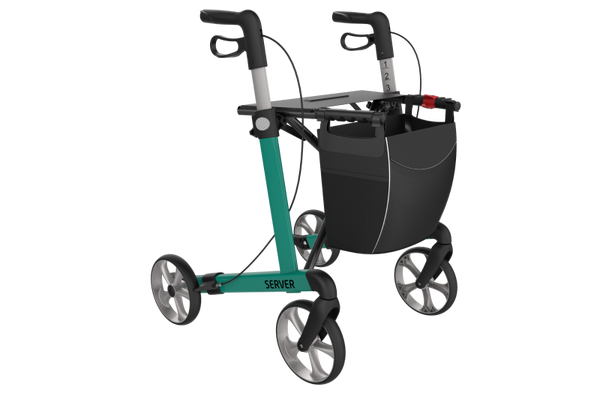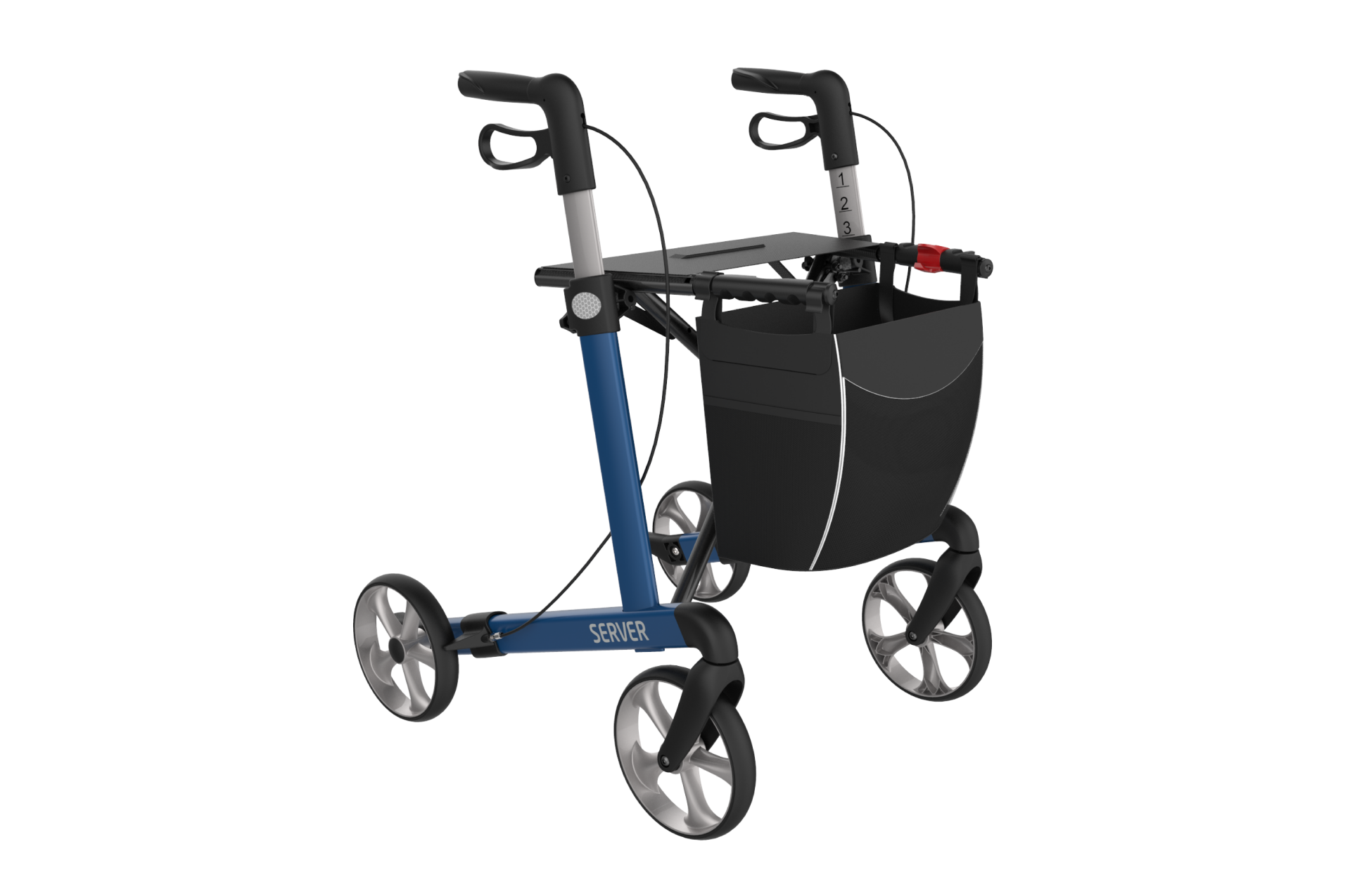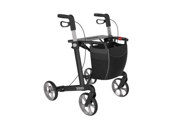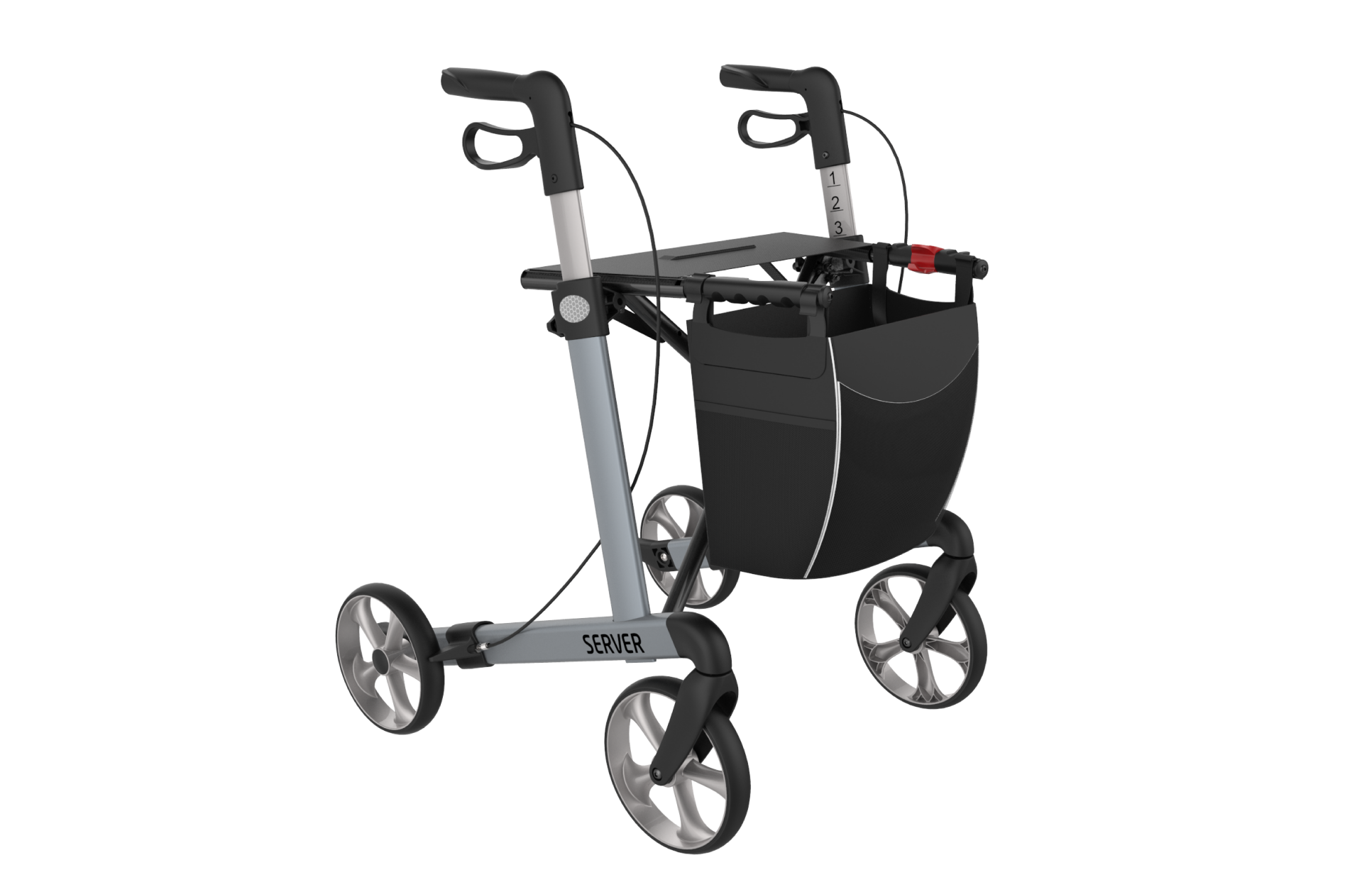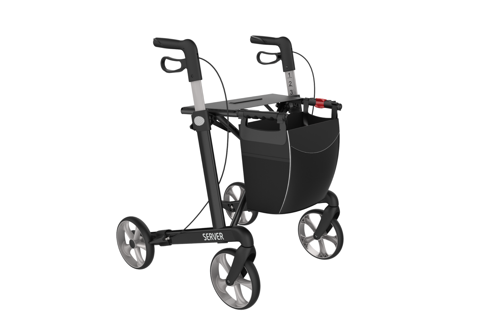 De Server is eenvoudig in te klappen en blijft gesloten door het eenvoudige vergrendelingssysteem welke tevens dient als ergonomisch gevormd handvat waarmee de rollator opgepakt kan worden.