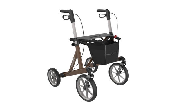 Outdoor rollator met een breed frame en grote zachte wielen, voor veel stabiliteit.